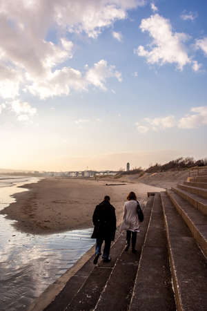 Milford on Sea, UK - July 13, 2019: Couple by the sea at sunset in Milford on Sea, a traditional English village famous for breathtaking cliff top walks with spectacular views and great pebble beaches