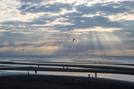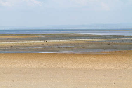 Beautiful bright view on South Dublin and the Mountains seen from Sandymount Beach, Dublin, Ireland during lowest tide. Walking people. Open spaces. High resolution