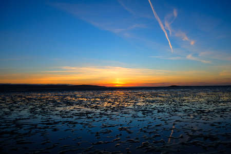 Sunset on the beach and sea with twilight sky when neap tide in Thailand. Inspiration concept.