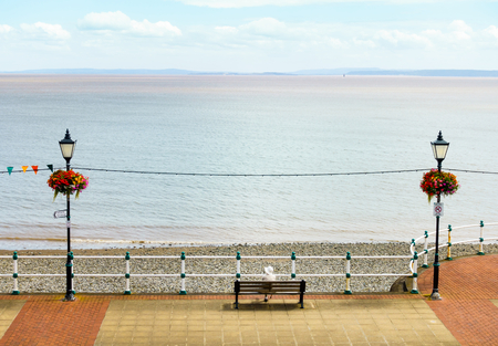 Aerial view of a elderly woman sitting on a bench on the esplanade in Penarth looking at the sea.