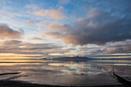 Beautiful calm sea water on a cold winters day. Giant stones are placed as sea defence infrastructure due to rising sea levels and global warming. Pebble beach with mountain backdrop.