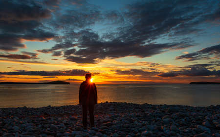 Silhouette of a single person standing on black beach with pebbles in front of sunset, Iceland