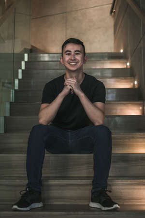 Asian young handsome man sitting on the stairs shop and smiling. Chinese guy, millennials life, lifestyle in the big city, Modern Asia, coffee break