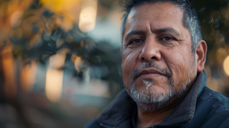 A close-up portrait of a mature man with a gray beard, looking directly at the camera. He is wearing a dark blue jacket and has a serious expression on his face. The background is out of focus and blurred features red foliage and lights. The image captures the mans gaze and the lines on his face, suggesting a life full of experience and wisdom.
