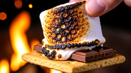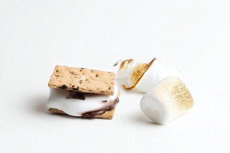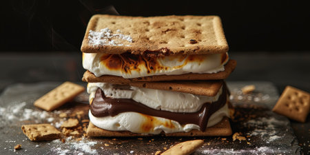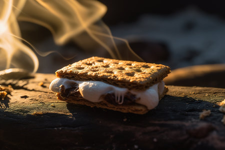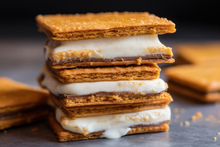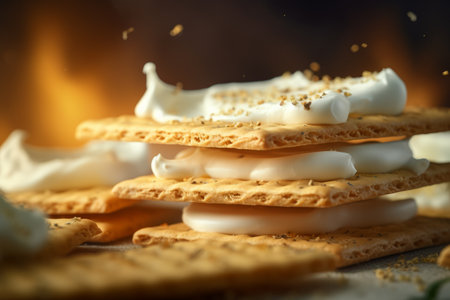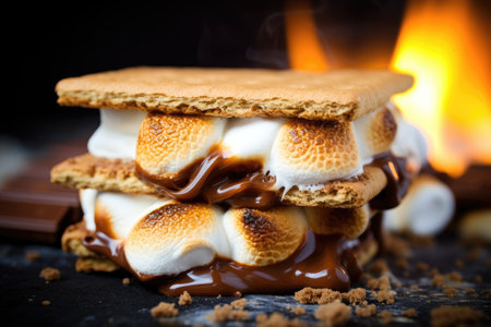 close-up of gooey marshmallow sandwiched between graham crackers, created with generative ai