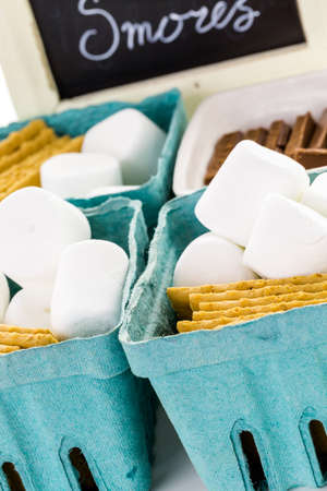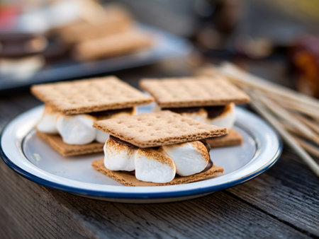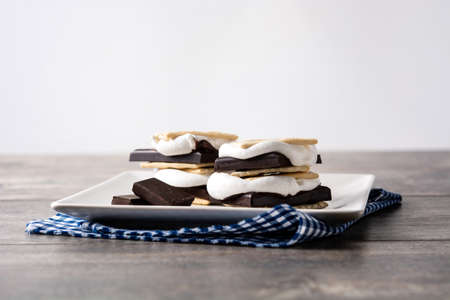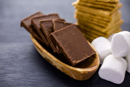 Picnic dessert smores with marshmallows, graham crackers and chocolate