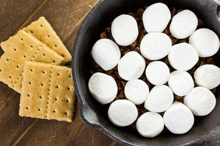 Preparing smores dip prepared with large marshmallows in cast iron pan.