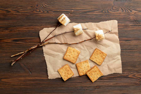marshmallows, chocolate and cookies for making smore on brown background. view from above. copy space