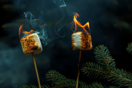 Two marshmallows roasting over hot coals with smoky wisps creating a sense of warmth and indulgence.