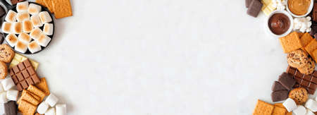 Smores buffet double border. Roasted marshmallows, crackers, chocolate and a collection of ingredients. Above view over a white marble background.