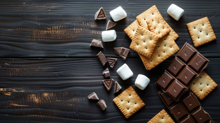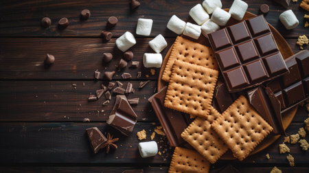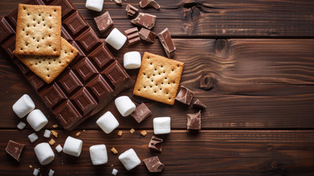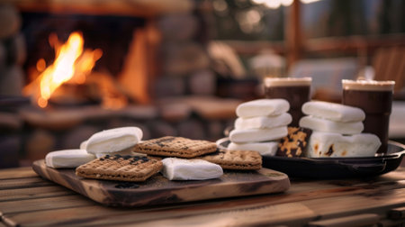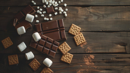 A wooden table featuring a tempting display of food ingredients like chocolate, marshmallows, and crackers, perfect for making delicious indoor smores AIG50