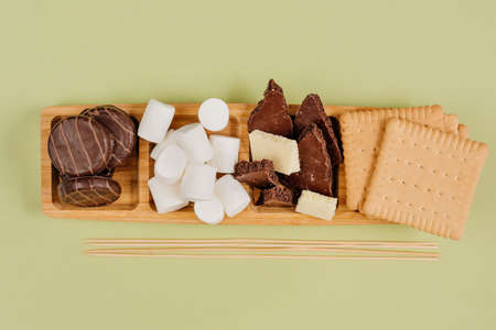 S'mores roasting marshmallows with chocolate between cookies on green background with blank space for text. Top view, flat lay.