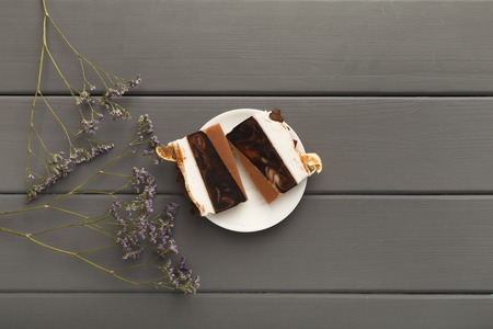 Tasty dessert background. Chocolate cake pieces on gray rustic table with violet flowers, Provence style, top view, copy space