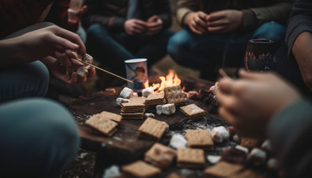 Friends enjoy a cozy night around a campfire, roasting marshmallows and making s'mores.