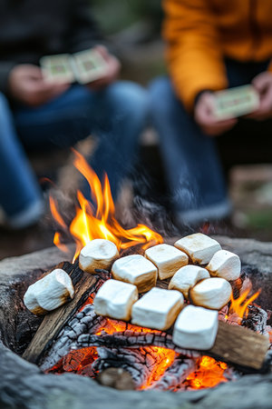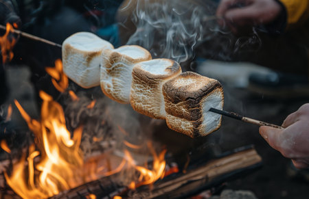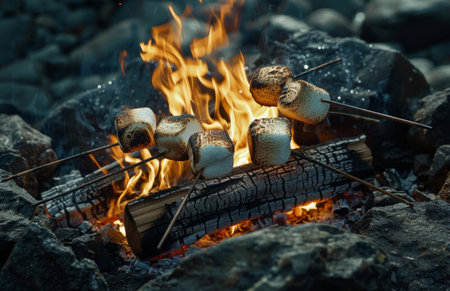 Cozy Camping Golden Marshmallows Roasting Over Campfire, Perfect for Summer Evenings