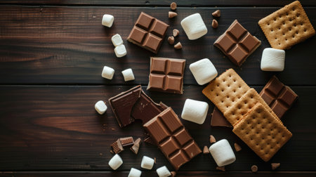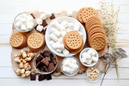 Smores feast Toasted marshmallows, biscuits, chocolate, diverse fixings Aerial shot over white woode