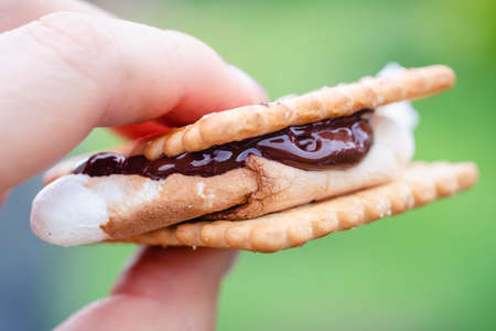 Woman's hands holding a sandwich with chocolate and ice cream over the campfire