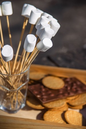 Marshmallows pinned on wooden sticks in a glass on a tray with cookies and chocolate for a spring picnic