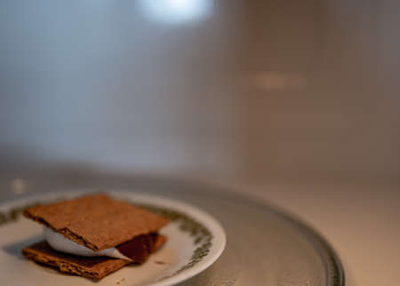 Making a smore with a marshmallow, cracker, and chocolate using a microwave.