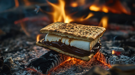 Warm and gooey marshmallows sandwiched between chocolate and graham crackers, cooked over a campfire