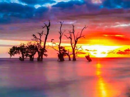 The sun shines with silhouette through the beach is receding and small hill at Rote Island, Indonesia.