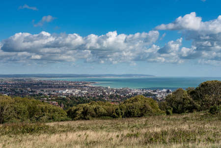 Panoramic overview of the seaside town of Eastbourne from the downs leading to Beachy Head