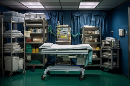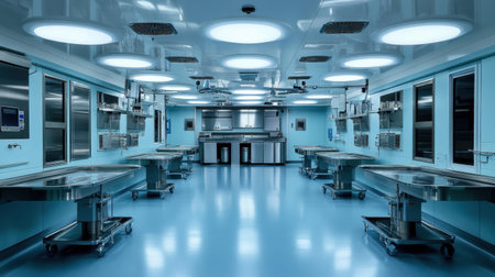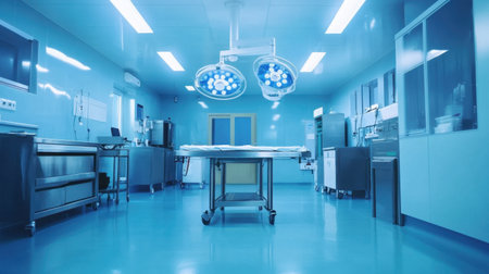 This image showcases a modern surgical room characterized by a clean and sterile environment with bright lighting and blue walls, designed for healthcare professionals.