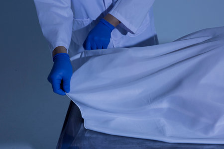 Dead body, corpse covered with white blanket.