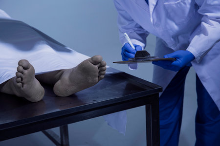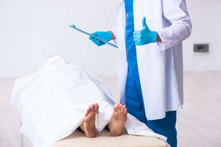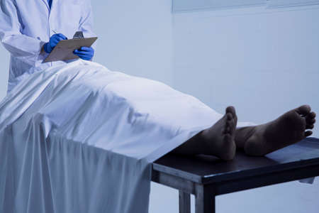 Police coroner examining dead body corpse in morgue