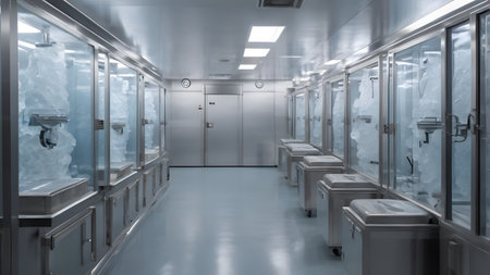 This image showcases a modern medical facility with stainless steel equipment, featuring bright lighting and clean, organized spaces for clinical purposes.