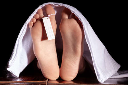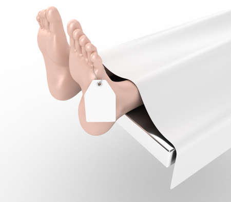 Human corpse covered with a sheet and name tag on the toe with white background
