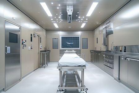 A modern surgical room showcasing a bright and sterile environment, equipped with advanced medical technology and an operating table, perfect for healthcare-related visuals.