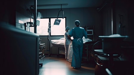 Back view of surgeon woman in a hospital intensive care unit. Generative AI