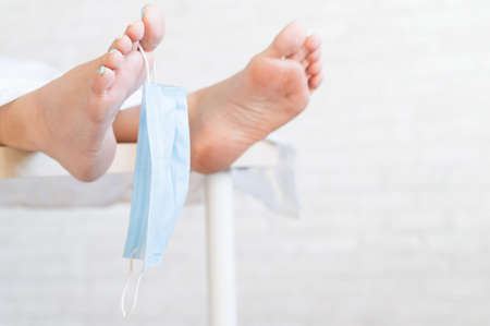 Close-up of dead men feet in a morgue with a medical mask on a toe. An unrecognizable woman has died from the coronavirus