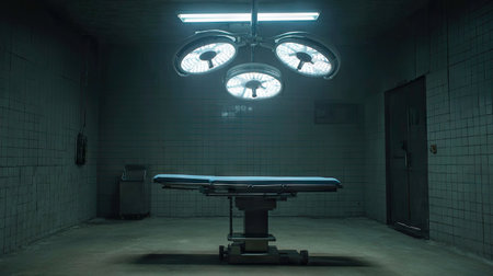 An empty surgical room featuring a blue surgical table, overhead lights illuminating the space, and a sterile, clinical atmosphere. The image conveys a sense of solitude and readiness for medical procedures in a modern healthcare environment.