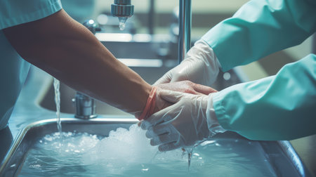 Closeup surgeon operating hands in ward. Unknown nurse give medical instruments. Doctors team working performing surgery in intensive care unit. Healthcare workers provide surgical treatment in clinic