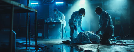 An Investigation Team working at night on a crime scene. A female police officer briefs a detective on the victim's body. Forensics and paramedics work. Cinematic shot.