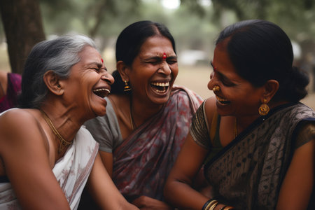 Smiling women in village meeting room vibrant clothing natural light candid atmosphere warm tones