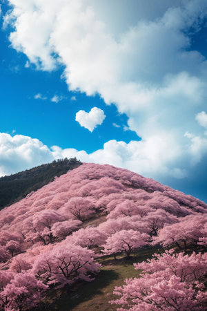 A hill side full of blooming sakura trees with a herat shaped cloud above it.