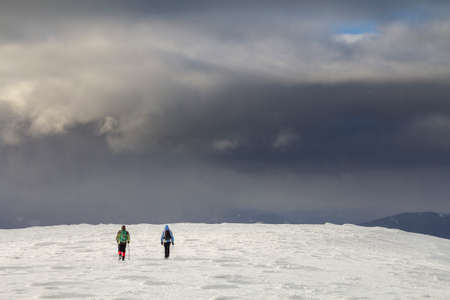 Winter mountain landscape. Back view of travelers tourist hikers with backpacks on snowy field walking towards distant mountain on cloudy dark blue stormy sky copy space background on cold winter day.