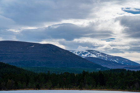Scenic view of the Loch Glascarnoch and the surrounding hills on a spring sunny day as viewed from the Glascarnoch Dam in Scotland, UK