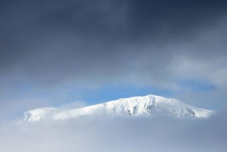 Minimalist view of snow-capped mountain wall in thick low clouds in sunshine. Scenic bright mountain landscape with white-snow peak among dense clouds in blue sky. Wonderful scenery with snowy top.