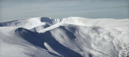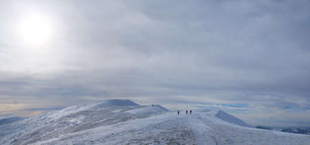 Panoramic view of snowy mountain range with hikers on it in cloudy winter day