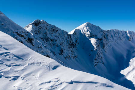 North wall of the peaks (Rohacze (Rohace)) in the shadows and frozen snow.