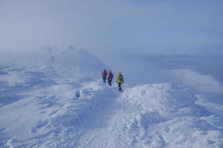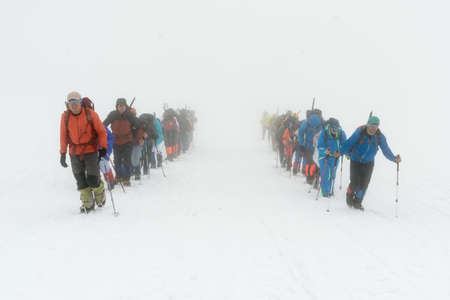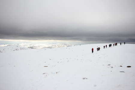 Group of mountaineers walking trough the mountains covered with snow.