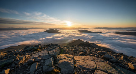 Evening view from the summit of Ben Lomond to the neighboring peaks at sunset. Loch Lomond and The Trossachs National Park. Scotland