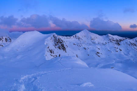 Beautiful winter mountain views during a snowshoe hike along the red ridge trail around Kosarisko Peak in the Low Tatras, Slovakia - silhouettes of tourists on trail