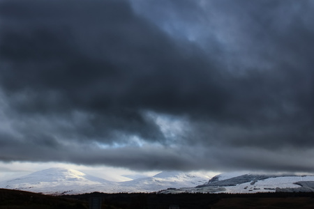 Epic dramatic storm clouds over the snowy peaks in the Highlands of Scotland in the early winter.