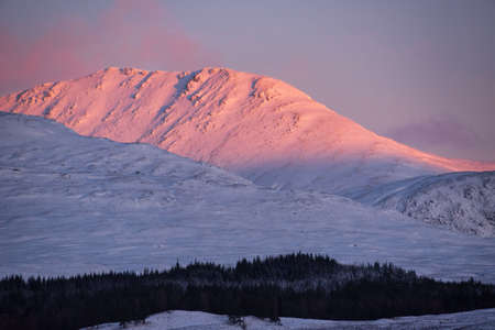 Beautiful Alpen Glow hitting mountain peaks in Scottish Highlands during stunning Winter landscape sunrise