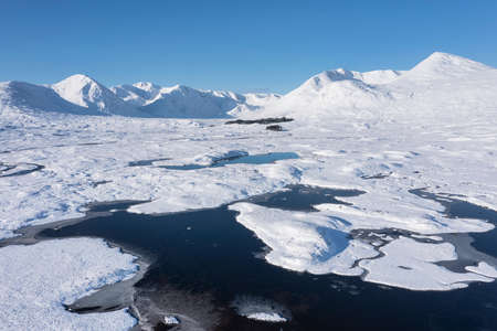 Stunning aerial drone Winter landscape images of Loch Ba and snow covered mountains in background in Scottish Highlands